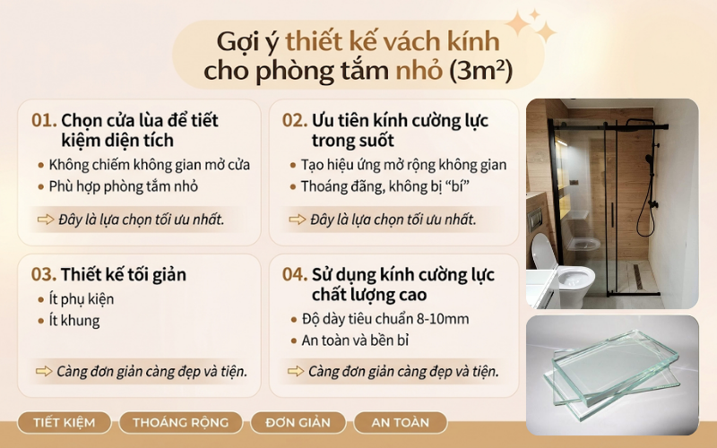 Khám phá cách vách kính giúp phòng tắm 3m² trở nên rộng rãi, sạch sẽ và hiện đại hơn, cùng kinh nghiệm thiết kế tối ưu không gian nhỏ.