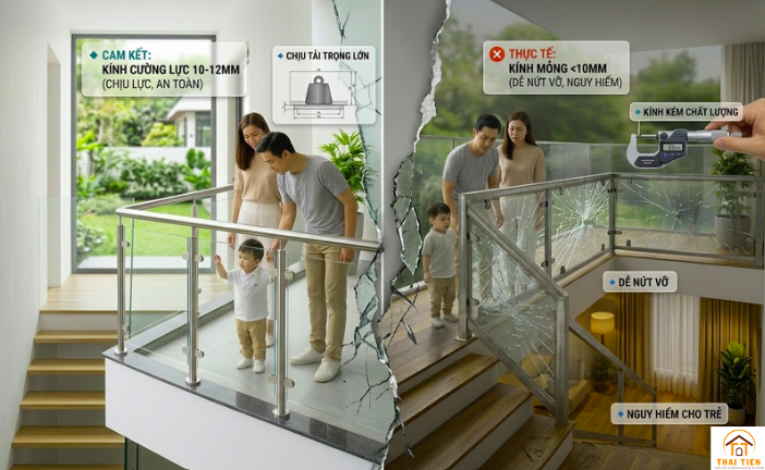 Những chiêu trò “treo đầu dê bán thịt chó” trong thi công lan can kính giá rẻ không chỉ khiến bạn mất tiền mà còn tiềm ẩn nguy cơ mất an toàn.