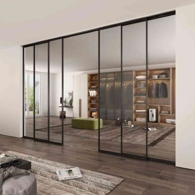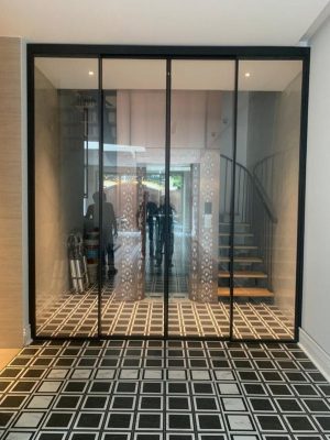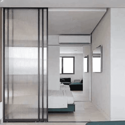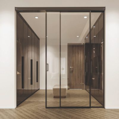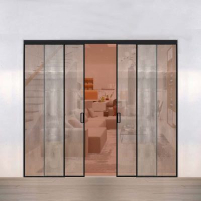 • Hệ cửa trượt không ray dưới, giúp tạo cảm giác không gian liền mạch, không bị vướng víu như các loại cửa truyền thống.