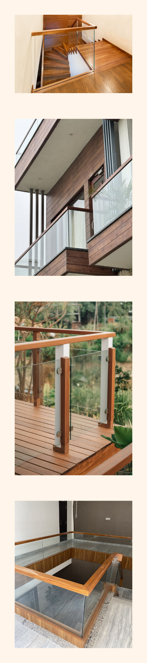 Lan can kính tay vịn gỗ có thể được sử dụng cho nhiều vị trí như cầu thang, ban công, hành lang hoặc giếng trời.